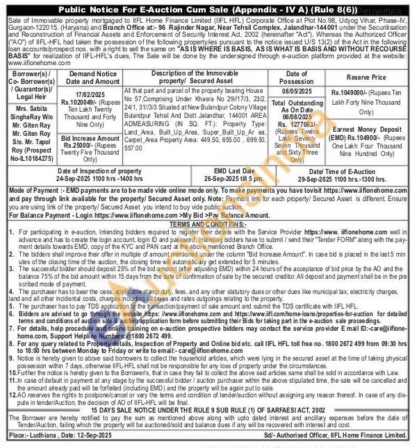 All that part and parcel of the property bearing House No 57. Comprising Under Khasra No 29/117/3, 23/2, 24/1, 31//3/3 Situated at New Bulandpur Colony Village Bulandpur Tehsil And Distt Jalandhar, 144001 AREA ADMEASURING (IN SQ. FT.): Property Type: Land Area, Built Up Area, Super Bult Up Area. Carpet Area Property Area: 449.50, 655.00 699.50. 557.00