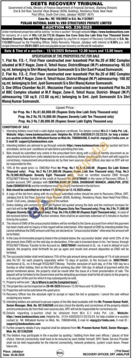 Flat No. F.S.-2, First Floor constructed over leasehold Plot No.20 of BBC Complex situated at M.P. Nagar, Zone-II, Tehsil Huzur, District Bhopal (M.P) admeasuring-108.92 sq.mt. belonging to Smt. Jyoti Somvanshi S/o Shri Manoj Kumar Somvanshi