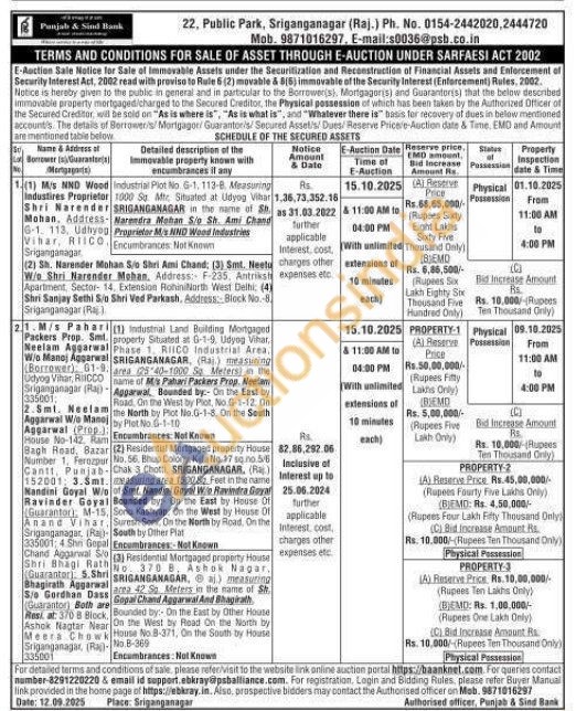 industmal Land Building Mortgaged property Situated at G-1-9, Udyog Vihar Phase 1. RIICO Industrial Area, SRIGANGANAGAR (Raj.) measuring area (26 40-1000 SQ. Meters in the name of Mis Pabari Packers Prop. Neelam Aggarwal, Bounded by:- On the East by Road. On the West by Plot, No. G-1-12, On 2.Smt. Neelam the North by Plot flo G-1-8. On the South by Plet No 6-1-10