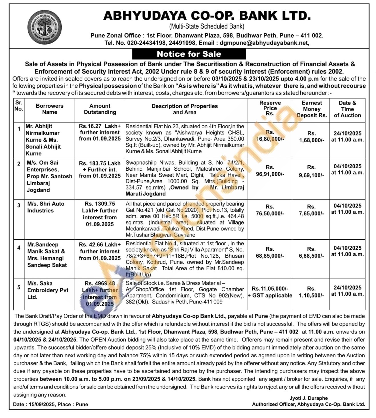 Contact Tel. No. 020-24434198, 24491098, Email: dgmpune@abhyudayabank.net