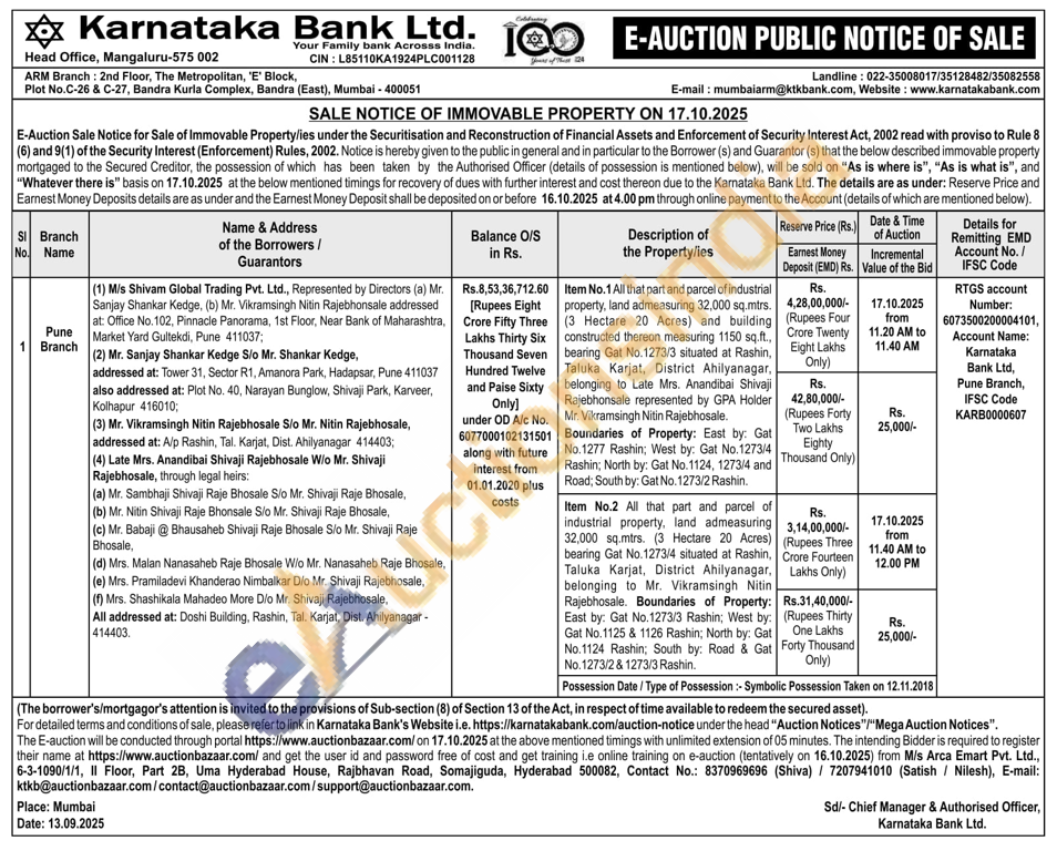 Item No.1 All that part and parcel of industrial property, land admeasuring 32,000 sq.mtrs. (3 Hectare 20 Acres) and building constructed thereon measuring 1150 sq.ft., bearing Gat No. 1273/3 situated at Rashin, Taluka Karjat, District Ahilyanagar, belonging to Late Mrs. Anandibai Shivaji Rajebhonsale represented by GPA Holder Mr. Vikramsingh Nitin Rajebhosale Boundaries of Property: East by: Gat No.1277 Rashin; West by: Gat No.1273/4 Rashin; North by: Gat No.1124, 1273/4 and Road; South by: Gat No. 1273/2 Rashin