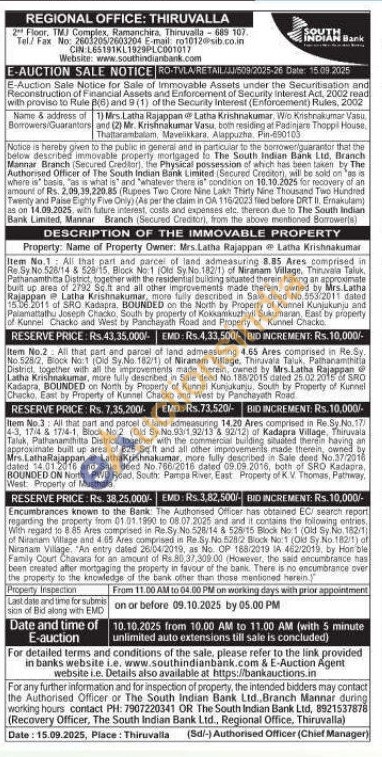 Item No.3: All that part and parcel of land admeasuring 14.20 Ares comprised in Re Sy No.17 4-3, 174 & 17:4-1, Block No 2 (Old Sy No. 93/192/13 & 92/12) of Kadapra Village. Th Talak, Pathanamthitta District, log Thiruvala Pathanamthitta District, together with the commercial building situated therein having an approximate built up area of 625 Soft and all other improvements made therein, owned by Mrs.LathaRajappan LathaKrishnakumar, more fully described in Sale deed No.37/2018 dated 14.01.2016 and Sale deed No.766/2016 dated 09.09.2016, both of SRO Kadaora, BOUNDED ON North PWD Road, South: Pampa River, East Property of K.V. Thomas, Pathway, West Property of Musthala
