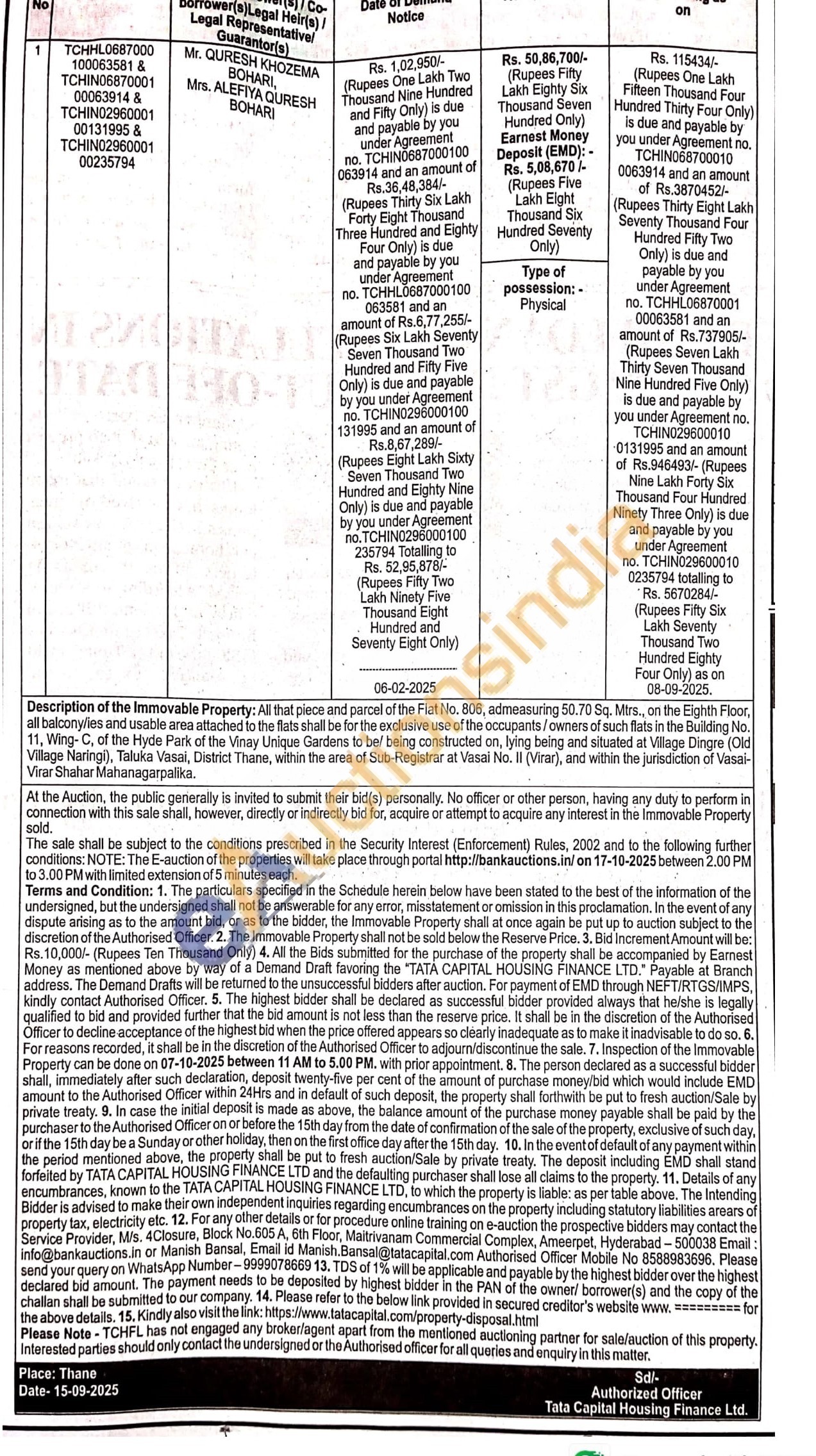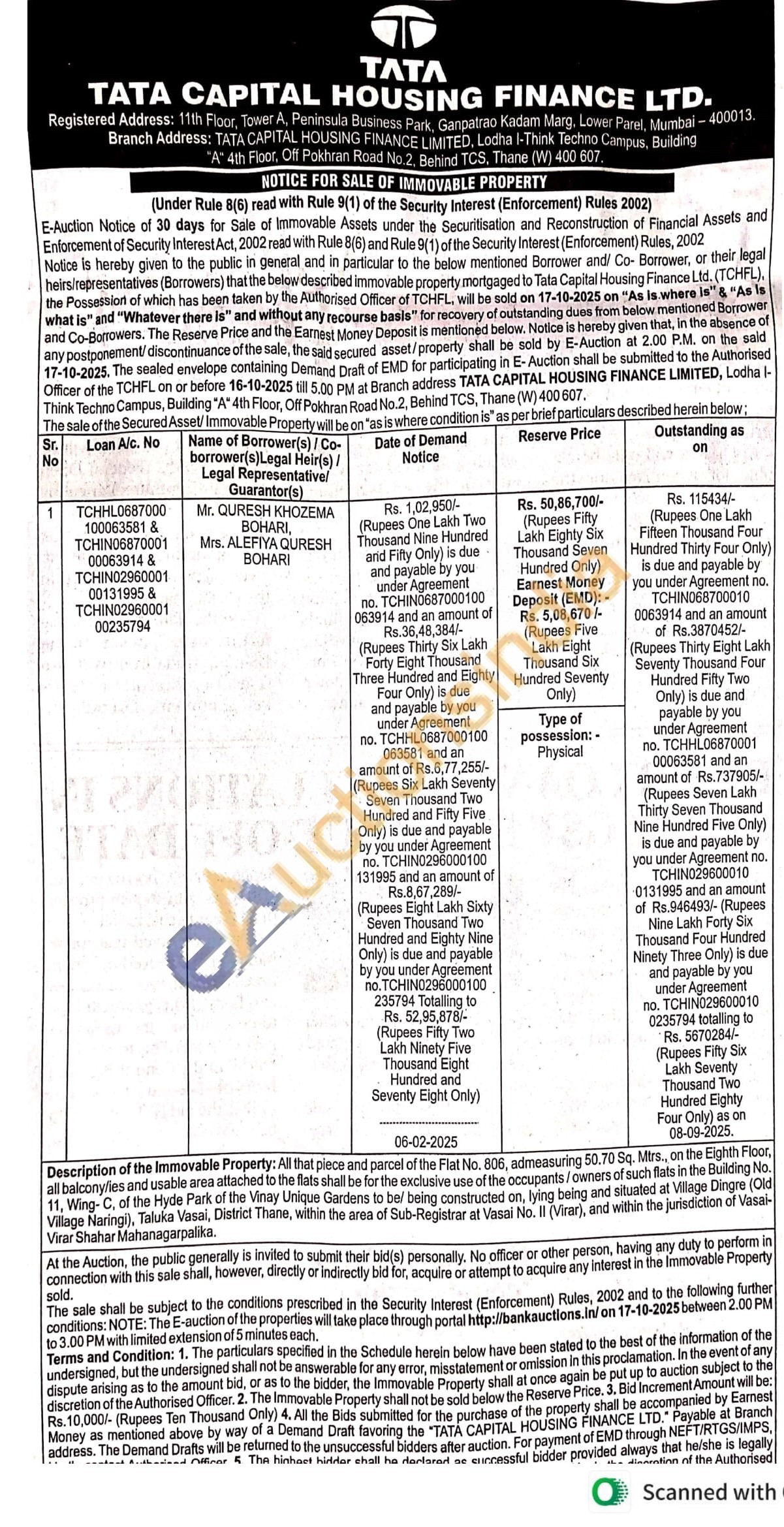 All that piece and parcel of the Flat No. 806, admeasuring 50.70 Sq. Mtrs, on the Eighth Floor, all balconyfies and usable area attached to the flats shall be for the exclusive use of the occupants/owners of such flats in the Building No. 11, Wing-C, of the Hyde Park of the Vinay Unique Gardens to bel being constructed on, lying being and situated at Village Dingre (Old Village Naringi), Taluka Vasai, District Thane, within the area of Sub-Registrar at Vasai No. II (Virar), and within the jurisdiction of Vasai-Virar Shahar Mahanagarpalika.