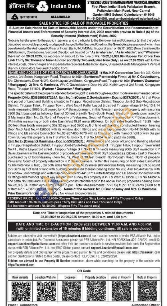 All that Piece and parcel of Land and Building situated in Tiruppur Registration District, Tiruppur Joint-2 Sub-Registration District, Tiruppur Taluk, Tiruppur Town, Ward No.41 Kathir Layout 3rd street Tiruppur village SF No.13 & 14 lands measuring 9065 Sq.ft owned by KP Balasubramani, in this Western portion of property admeasuring 3900 Sq.ft bounded as follows:- East of 30 feet breadth North-South Road, West of Property purchased by G Manimala (Item No. 2), North of Property of Velusamy, South of Property retained by KP Balasubramani. Within this measuring on both sides East-West 19.81 meter (65 feet), On both sides North-South 18.29 meter (60 feet) thus totally measuring 362.32 sq.mt (or) 3900 sq.ft of land with building constructed thereon bearing Door No.3 Asst No.44126508 with its window door fittings and water tap connection No.44107465 with its fittings and EB service Connection No.03-207-005-4670 with its fittings and with mamool right of way (As per Town Survey this property is in TS Ward G, Block 3. TS No.14/2A1A and patta no 5388).