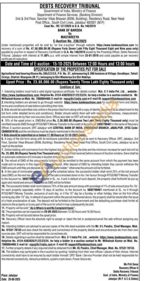 Agricultural land bearing Khasra No. 285/2/2/2/5, P.H. No. 37, admeasuring 0.396 hectares at Village: Gorakhpur, Tehsil: Zirniya, District: Khargone (M.P.); belonging to Shri Mastariya S/o Shri Nakliya.