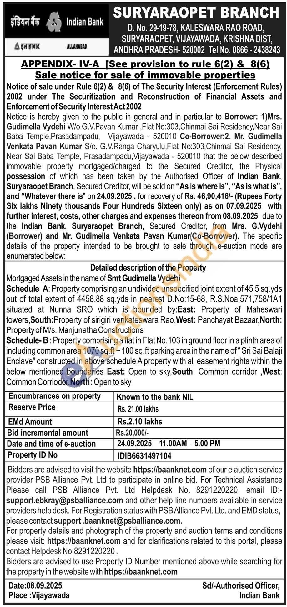 Schedule A: Property comprising an undivided unspecified joint extent of 45.5 sq.yds out of total extent of 4458.88 sq.yds in nearest D.No:15-68, R.S.Noa.571,758/1A1 situated at Nunna SRO which is bounded by:East: Property of Maheswari towers, South: Property of sirigiri venkateswara Rao, West: Panchayat Bazaar, North: Property of M/s. Manjunatha Constructions