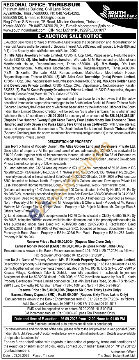 Description of property:-All that part and parcel of land admeasuring 0.166 HA equivalent to 41.55 Cents, together with all improvements thereon, situated in Sy No. 105/1D1, Re Sy No. 5-21-990/1 of Kasaba Village, Kozhikode Taluk & District, more fully described in schedule to jenmom Assignment deed No.822/2008 dated 19.08.2008 of SRO Kozhikode owned by Mis RI Kanth Property Developers Private Limited bounded on East-Mini Bye Pass Road, South-TS No 5-21-990/1 (Land Owned by PD Abraham), West-TS No 1004 and North-TS No 5-21-990/1