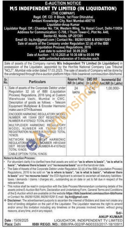 1. Sale of assets of the Corporate Debtor under Regulation 32 (d) of IBBI (Liquidation Process) Regulations, 2016 lying at Custom Warehouse Vashi, Mumbai in CWC. Description of goods as follows: Telecom Equipment Multiplexer & Encoder Harmonic make use in DTH BusinessENCODER HARMONIC REGULATORY MODEL NUMBER: HR 1304W DEIT REGISTRATION NUMBER-R-41076422: TOTAL 40 NOSMULTIPLEXER HARMONIC REGULATORY MODEL NUMBER HR 1304W DEIT REGISTRATION NUMBER-R-41076422: TOTAL 16 NOS NETWORK MANAGEMENT HARMONIC REGULATORAY MODEL NUMBER HR1034W DEIT REGISTRATION NUMBER-R-41076422 TOTAL 10 NOS CABLE OPTION TOTAL 10 NOS