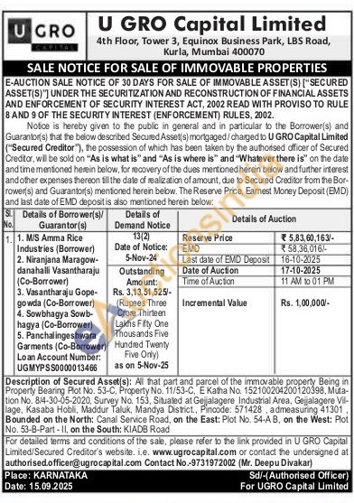 Description of Secured Asset(s): All that part and parcel of the immovable property Being in Property Bearing Plot No. 53-C, Property No. 11/53-C, E Katha No. 152100204200120398, Muta-tion No. 8/4-30-05-2020, Survey No. 153, Situated at Gejjalagere Industrial Area, Gejjalagere Vil-lage, Kasaba Hobli, Maddur Taluk, Mandya District, Pincode: 571428, admeasuring 41301 Bounded on the North: Canal Service Road, on the East: Plot No. 54-AB, on the West: Plot No. 53-B-Part-II, on the South: KIADB Road
