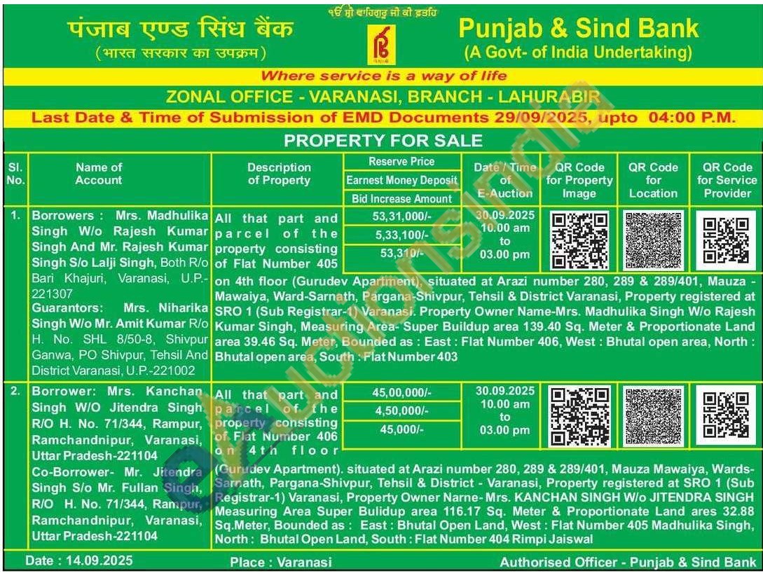 All that part and parcel of the property consisting of Flat Number 405 of Flat Number 405 on 4th floor (Gurudev Apartment), situated at Arazi number 280, 289 & 289/401, Mauza -Mawaiya, Ward-Sarnath, Pargana-Shivpur, Tehsil & District Varanasi, Property registered at SRO 1 (Sub Registrar-1) Varanasi. Property Owner Name-Mrs. Madhulika Singh W/o Rajesh Kumar Singh, Measuring Area- Super Buildup area 139.40 Sq. Meter & Proportionate Land area 39.46 Sq. Meter, Bounded as: East: Flat Number 406, West: Bhutal open area, North: Bhutal open area, South: Flat Number 403