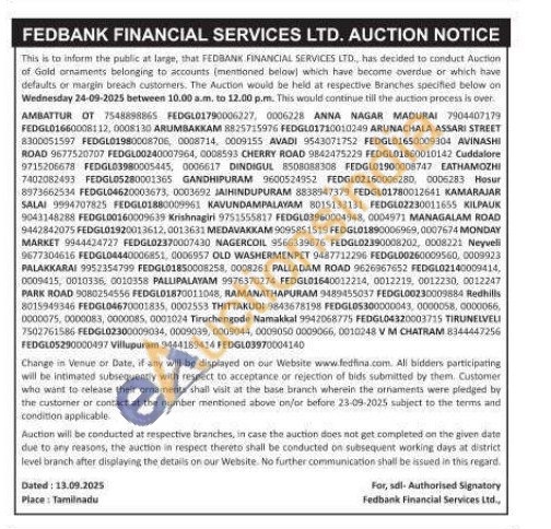 Fedbank Financial Services Ltd Gold Auctions Auction in Chennai