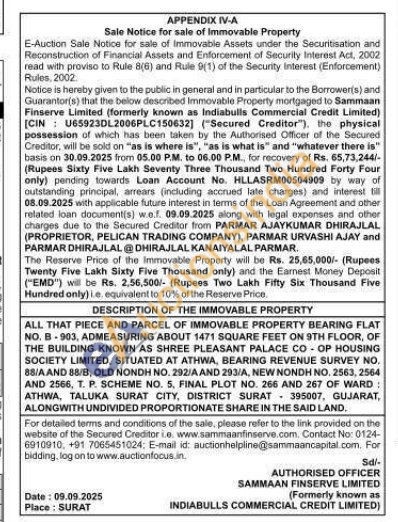 ALL THAT PIECE AND PARCEL OF IMMOVABLE PROPERTY BEARING FLAT NO, B-903, ADMEASURING ABOUT 1471 SQUARE FEET ON 9TH FLOOR, OF THE BUILDING KNOWN AS SHREE PLEASANT PALACE COOP HOUSING SOCIETY LIMITED, SITUATED AT ATHWA, BEARING REVENUE SURVEY NO. 88/A AND 88/8, OLD NONDH NO. 292/A AND 293/A, NEW NONDH NO. 2563, 2564 AND 2566, T. P. SCHEME NO. 5, FINAL PLOT NO. 266 AND 267 OF WARD: ATHWA, TALUKA SURAT CITY, DISTRICT SURAT 395007, GUJARAT, ALONGWITH UNDIVIDED PROPORTIONATE SHARE IN THE SAID LAND.