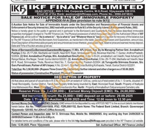 All that piece and parcel of vacant site in R.S. No. 672/3, with an extent of 1200 sq yards out of total extent of Ac. 1.13 cents, situated AT Tenali Municipality, Guntur District, Tenali Sub-Registry limits being bounded by East: Municipal Road, South: Property of Kadiyala Uma Maheswara Rao, West: Property of Talluri Ramachandra Rao, North: Property of Annabathuni Satyanarayana Cemetery site