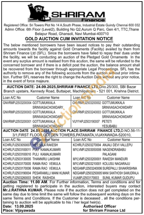 Shriram Finance Ltd Gold Auctions Auction in Chennai
