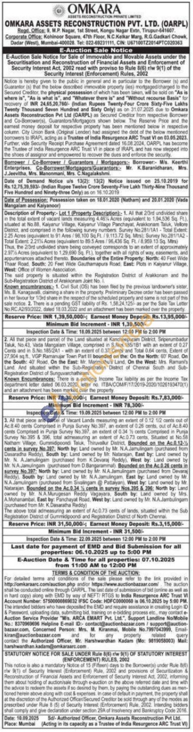 All that pece and parcel of the Land situated at Kancheepuram District, Sniperumbadur Taluk, No.43, Vada Mangalam Village, comprised in S.Nos 185/181 with an extent of 0.27 Cents and in 5.No. 185/241-with an extent of 0.37 Cents and Total 0.64 cents, Extent of 27,904 sqft, VGP Ramanujar Town Part 1 bounded on the On the North: 60 Road, On the South: 40 Road. On the East: Mr. Morimuthu's Land. On the West: Mrs. Ramani's Land And situated within the Sub-Registration District of Chennai South and Sub Registration District of Sunguvarchathiran Known Encumbrances: There is a pending Income Tax lability as per the Income Tax department letter dated 06.03.2020, letter no. ITBA/COM/F/17/2019-2020/1026193470(1) and an attachment has been marked over the property
