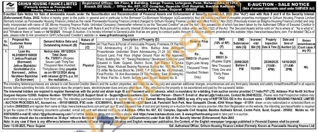 All That Piece & Parcel of Immovable Property, Premises Of Flat No. 102 Admeasuring 41.20 Sq. Mtrs. Builtup Area Alongwith Proportionate Undivided Share Admeasuring 21.24 Sq. Mtes, In Ground Land, First Floor (Higher Ground Floor As Per Approved Plan), Building No. "A", "Swarg Residency" Developed Upon Na Land Situated In State: Gujarat, District: Surat, Sub District & Taluka: Kamrej, Moje: Kholvad Bearing Revenue Survey No. 167, Block No. 72 (After Re-Survey Block No. 2848), T. P. Scheme No. 48 (Kholvad), Final Plot No. 19. And Boundaries Of The Property: East: Building No. R, West: Flat No. 3, North: Society Land, South: Building No. B.