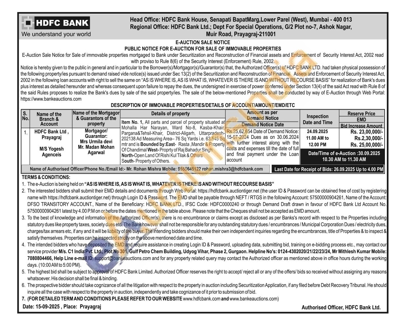 Item No. 1, All parts and parcel of property situated at Mohalla Har Narayan, Ward No-8, Kasba-Khair, Pargana& Tehsil-Khair, District-Aligarh, Uttarpradesh-202138 Ad Measuring Area-76 Sq Yards i.e. 63.545 Sq mtr and is Bounded by:East- Rasta, Mandir & Property Of Chandimal West-Proprty of Raj Bahadur Singh North-Open Land Of Rishi Kul Tilak & Others South-Property of Others.