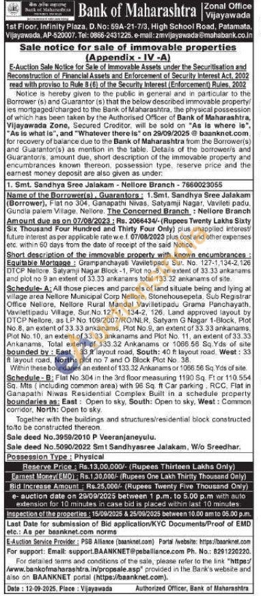 description of the immovable property with known encumbrances: Equitable Mortgage: Grampanchayati Vaviletipadu Sur. No. 127-1,134-2,126 DTCP Nellore Salyamji Nagar Block-1, Plot no -8, an extent of 33.33 ankanams and plot no 9 an extent of 33.33 ankanams total 133 32 ankanams of site Schedule- A: All those pieces and parcels of land situate being and lying al village area Nellore Municipal Corp Nellore, Stonehousepeta. Sub Registrar Office Nellore, Nellore Rural Mandal Vavilletipadu Grama Panchayath, Vavilettipadu Village, Sur. No. 127-1, 134-2, 126, Land approved layout by DTCP Nellore, as LP No 109/2007/RO/NLR, Satyam G Nagar 1-Block, Plot No.8, an extent of 33.33 ankanams, Plot No.9, an extent of 33.33 ankanams, Plot No. 10, an extent of 33.33 ankanams and Plot No. 11, an extent of 33.33 Ankanams, Total extent of 133.32 Ankanams or 1086 56 Sq. Yds of site bounded by: East: 33 ft layout road, South: 40 ft layout road. West: 33 ft layout road, North: plot no 7 and O Block Plot No. 38. Within these boundaries an extent of 133.32 Ankanams or 1066.56 Sq. Yds of site. Schedule-B: Flat No.304 in the 3rd floor measuring 1190 Sq. Ftor 110.554 Sq. Mts (including common area) with 96 Sq ft Car parking, RCC, Flat in Ganapathi Niwas Residential Complex Built in a schedule property boundaries as: East: Open to sky, South: Open to sky, West: Common corridor, North: Open to sky. Together with the buildings and structures/residential block constructed to/to be constructed thereon.