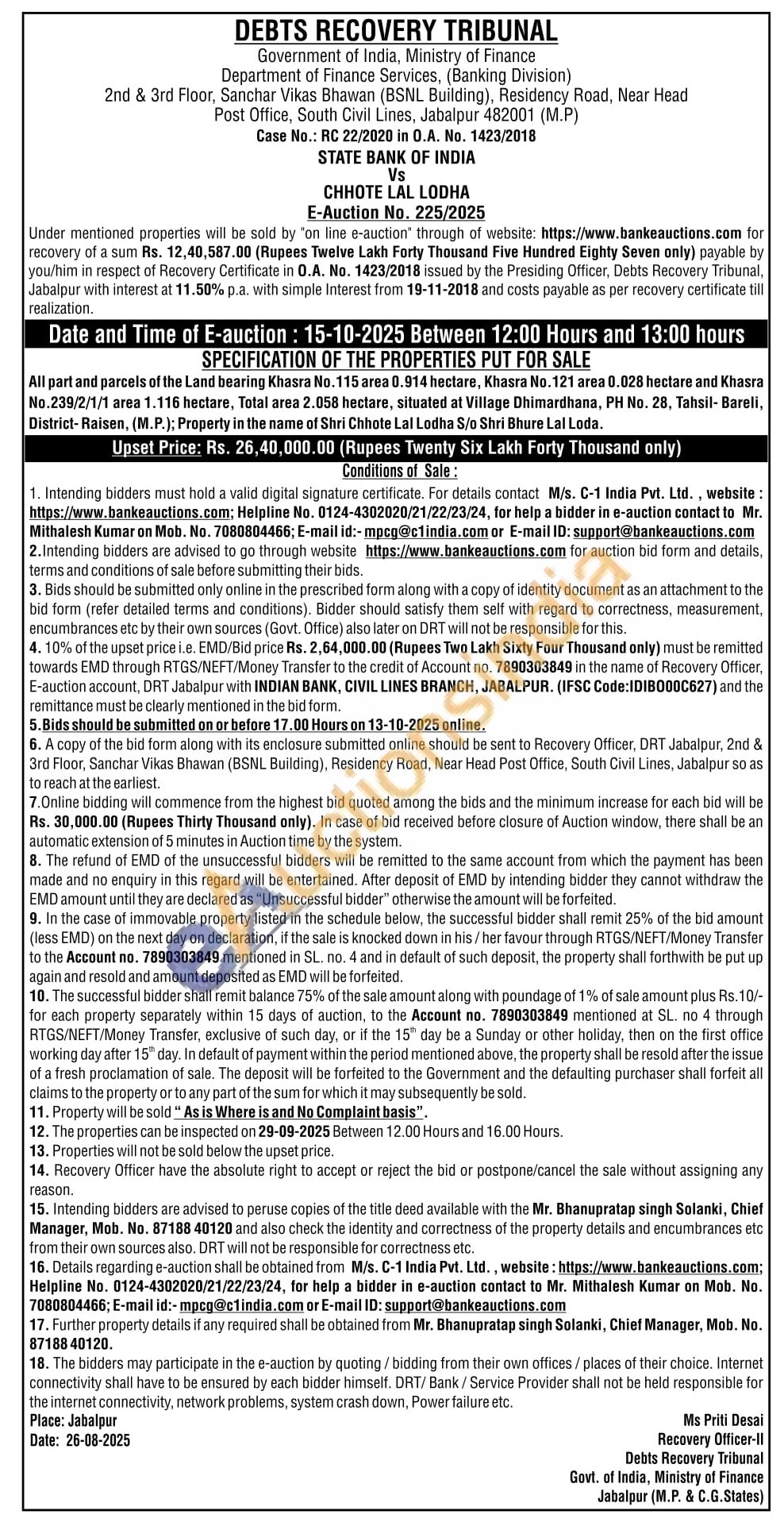 All part and parcels of the Land bearing Khasra No. 115 area 0.914 hectare, Khasra No. 121 area 0.028 hectare and Khasra No.239/2/1/1 area 1.116 hectare, Total area 2.058 hectare, situated at Village Dhimardhana, PH No. 28, Tahsil-Bareli, District-Raisen, (M.P.): Property in the name of Shri Chhote Lal Lodha S/o Shri Bhure Lal Loda.