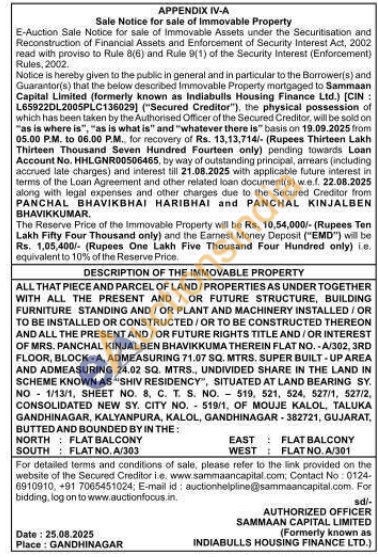 ALL THAT PIECE AND PARCEL OF LAND/PROPERTIES AS UNDER TOGETHER WITH ALL THE PRESENT AND OR FUTURE STRUCTURE, BUILDING FURNITURE STANDING AND/OR PLANT AND MACHINERY INSTALLED/OR TO BE INSTALLED OR CONSTRUCTED/OR TO BE CONSTRUCTED THEREON AND ALL THE PRESENT AND/OR FUTURE RIGHTS TITLE AND/OR INTEREST OF MRS. PANCHAL KINJALBEN BHAVIKKUMA THEREIN FLAT NO.-A/302, 3RD FLOOR, BLOCK-A, ADMEASURING 71.07 SQ. MTRS. SUPER BUILT-UP AREA AND ADMEASURING 24.02 SQ. MTRS., UNDIVIDED SHARE IN THE LAND IN SCHEME KNOWN AS "SHIV RESIDENCY", SITUATED AT LAND BEARING SY. NO 1/13/1, SHEET NO. 8, C. T. S. NO. 519, 521, 524, 527/1, 527/2, CONSOLIDATED NEW SY. CITY NO.519/1, OF MOUJE KALOL, TALUKA GANDHINAGAR, KALYANPURA, KALOL, GANDHINAGAR-382721, GUJARAT, BUTTED AND BOUNDED BY IN THE: