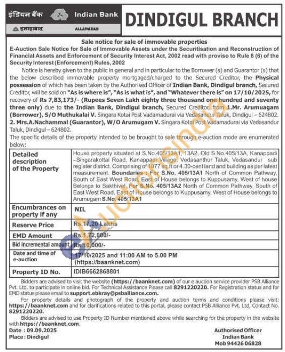 House property situated at S.No.405/13A1, 13A2, Old S.No.405/13A, Kanappadi -Singarakottai Road, Kanappadi Village, Vedasanthur Taluk, Vedasandur sub register district. Comprising of 1877 sq.ft or 4.30-cent land and building as per latest measurement. Boundaries: For S.No. 405/13A1 North of Common Pathway, South of East West Road, East of House belongs to Kuppusamy, West of house Belongs to Sakthivel. For S.No. 405/13A2 North of Common Pathway, South of East West Road, East of House belongs to Kuppusamy, West of House belongs to Arumugam S.No. 405/13A1