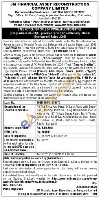 All That Piece And Parcel Of Land Along With Struc-ture Standing There On Being Commercial Plot In Khasra No. 187. Village Danau Kalan, Teshil Tunga, Jaipur, Area 52.88 Sq. Yard Bounded As East-Shop Of Roshan Lal, West Self Land, North Rasta, South-Self Land