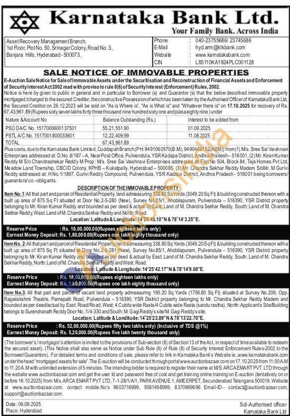 Item No.1:All that part and parcel of Residential Property, land admeasuring 338.80 Sq Yards (3049.20 Sq Ft) & building constructed thereon with a built up area of 875 Sq Ft situated at Door No.2-5-280 (New), Survey No.85/1, Ahobilapuram, Pulivendula 516390, YSR District property belonging to Mr. Kiran Kumar Reddy and bounded as per deed & actual by East: Land of M. Chandra Sekhar Reddy, South: Land of M. Chandra Sekhar Reddy, West: Land of M. Chandra Sekhar Reddy and North: Road.