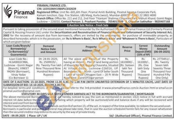Road West:-Land Of Digar person All The piece and Parcel of the Property having an extent Plot of land being portion of Khasra No.408, Bajrang Chauraha, Situated At Village Goyla, Lucknow-226016, UP. Boundaries As North-Land Of Seller South Land of Vinod Chhugani East 20 Ft Wide