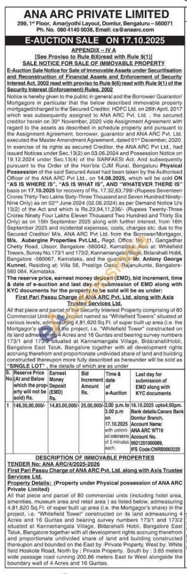 All that piece and parcel of 80 commercial units (including hotel area, amenities, museum area and retail area) as listed below, admeasuring 4,81.620 Sq.Ft. of super built up area (i.e. the Mortgagor's share) in the project, le. "Whitefield Tower constructed on its land admeasuring 4 Acres and 16 Guntas and bearing survey numbers 173/1 and 173/2 situated at Kannamangala Village, Bidarahalli Hobli, Bangalore East Taluk, Bangalore together with all development rights accruing therefrom and proportionate undivided share of land and building constructed thereupon and bounded on the East by Private Property, West by: White field Hoskote Road, North by: Private Property, South by: 3.65 meters wide passage road running 200.86 meters East to West alongside the boundary wall of 4 Acres and 16 Guntas.