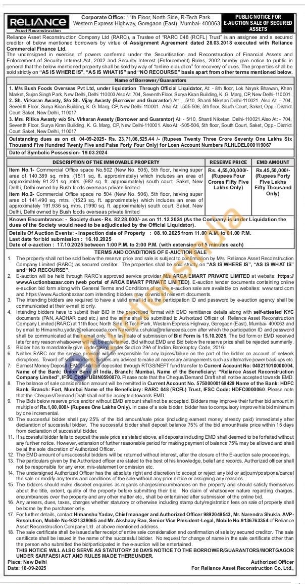 Item No.1- Commercial Office space No.502 (New No. 505), 5th floor, having super area of 140.389 sq mis (1511 sq. ft approximately) which includes an area of approximately 91.221 sq. mtrs. (982 sq. ft. approximately) south court, Saket, New Delhi, Delhi owned by Bush bods overseas private limited. Item No.2- Commercial Office space no 504 (New No. 506), 5th floor, having super area of 141.490 sq. mtrs (1523 sq. ft. approximately) which includes an area of approximately 191.936 sq mtrs. (1990 sq. ft. approximately) south court, Saket. New Delhi, Delhi owned by Bush foods overseas private limited