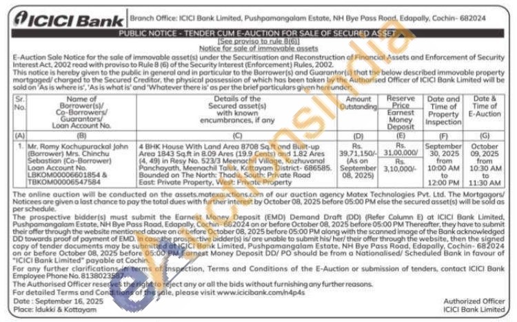House With Land Area 8708 Sq.ft and Built-up Area 1843 Sq.ft in 8.09 Ares (19.9 Cents) and 1.82 Ares (4, 49) in Resy No. 523/3 Meenachii Village, Kazhuvanal Panchayath, Meenachil Taluk, Kottayom District-686585 Bounded on The North: Thodu, South: Private Road East: Private Property, West: Private Property