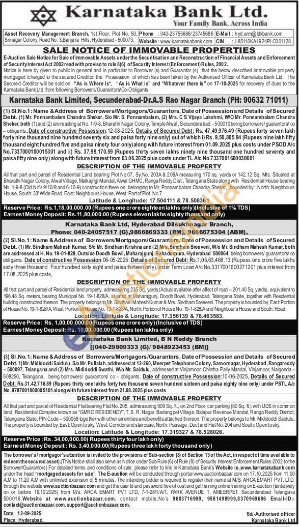 DESCRIPTION OF THE IMMOVABLE PROPERTY : All that part and parcel of Residential Land bearing Plot No.07, Sy. No. 203A & 209A measuring 170 sq. yards or 142.12 Sq. Mts. Situated at Bharathi Nagar Colony, Alwal Village, Malkajrigi Mandal, Alwal GHMC, Ranga Reddy Dist., Telangana State along with Residential House bearing No. 1-9-8 (Old No's 9/10/9 and 6-10-9) construction there on belonging to Mr. Ponnambalam Chandra Shekar, bounded by: North: Nieghbours House, South: 33' Wide Road, East: Neighbours House, West: Part of Plot. No.7.