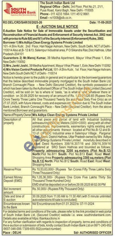 All that piece and parcel of land with Industrial building admeasuring 6500 sq. Meters (3200+3300) along with all other constructions, improvements, easmentary rights existing and all other appurtenants thereon located at Plot No.B-12 and B-13 of UPSIDC Industrial area in Salempur Village, Pargana/Tehsil Sasni, District Hathras, Uttar Pradesh owned by Mis Aditya Clean Energy Systems Private Limited morefully described in Lease Deed Numbers 306/16,307/16 and 308/16,309/16 registered at SRO Sasni Hathras and bounded as follows; Property admeasuring 3200 sq.meters (Plot No.B.12) North: Plot No B11 South: Plot No.813 East: Road West: Shopping Area Property admeasuring 3300 sq.meters (Plot No.B.13) North: Plot No.B12 South: Road East: Road West: Shopping Area