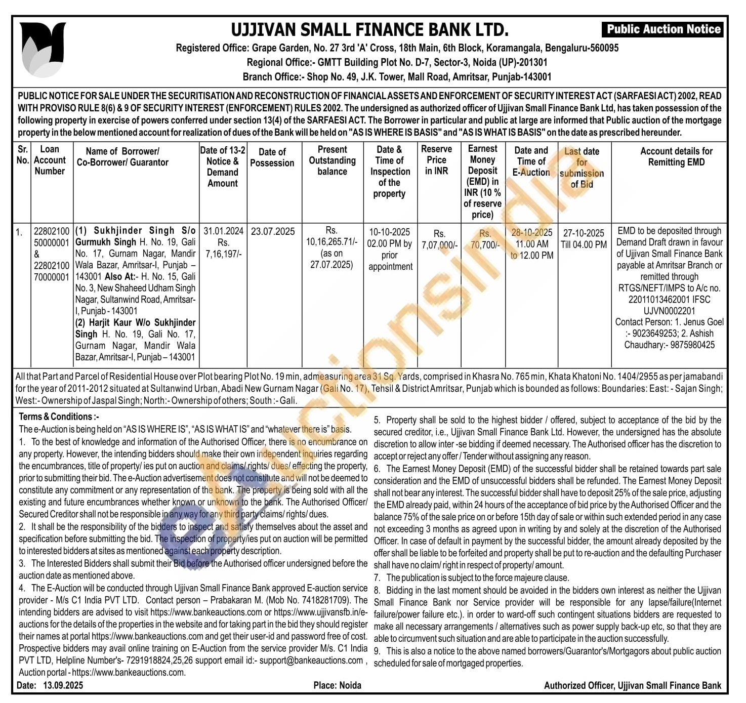 All that Part and Parcel of Residential House over Plot bearing Plot No. 19 min, admeasuring area 31 Sq. Yards, comprised in Khasra No. 765 min, Khata Khatoni No. 1404/2955 as per jamabandi for the year of 2011-2012 situated at Sultanwind Urban, Abadi New Gurnam Nagar (Gali No. 17), Tehsil & District Amritsar, Punjab which is bounded as follows: Boundaries: East: - Sajan Singh: West:-Ownership of Jaspal Singh; North:-Ownership of others; South:-Gali.