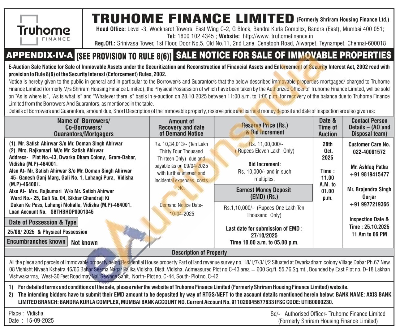 All the piece and parcels of immovable property being Residential House property Part of land revenue survey no. 18/1/7/3/1/2 Situated at Dwarkadham colony Village Dabar Ph.67 New 08 Vishisht Nivesh Kshetra 46/66 Bahar Seema Nagar Palika Vidisha, Distt. Vidisha, Admeasured Plot no.C-43 area = 600 Sq.ft. 55.76 Sq.mt., Bounded by East Plot no. D-18 Lakhan Vishwakarma, West-30 Feet Road may Nali Sewage Sahit, North-Plot no. C-44, South-Plot no. C-42