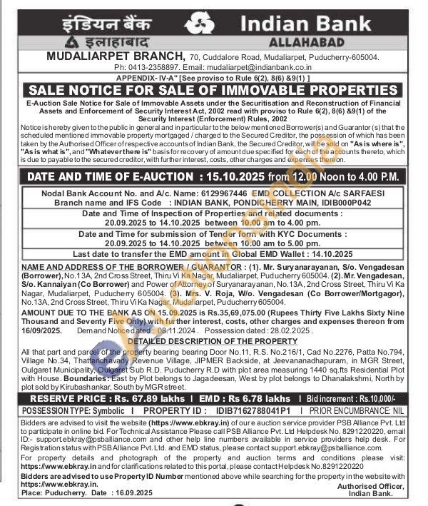 All that part and parcel of the property bearing bearing Door No.11, R.S. No.216/1, Cad No.2276, Patta No.794, Village No.34, Thattanchavady Revenue Village, JIPMER Backside, at Jeevananadhapuram, in MGR Street, Oulgaret Municipality, Oulgaret Sub R.D. Puducherry R.D with plot area measuring 1440 sq.fts Residential Plot with House. Boundaries: East by Plot belongs to Jagadeesan, West by plot belongs to Dhanalakshmi, North by plot sold by Kirubashankar, South by MGR street