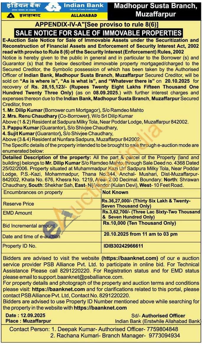 All the part & parcel of the Property (land and building) belongs to Mr. Dilip Kumar S/o Ramdeo Mahto, through Sale Deed no. 4368 Dated 25/02/2006. Property situated at Muhammadpur Kazi Urf Sadpura Milky Tola, Near Poddar Lodge, P.S.-Kazi, Mohammadpur, Thana No.344, Anchal- Mushari, Dist-Muzaffarpur-842002, Khata No. 676, Khesra No. 1219, Area- 2.00 Decimal. Boundary: North: Shrawan Chaudhary, South: Shekhar Sah, East- Nij Vendor (Kulan Devi), West- 10 Feet Road