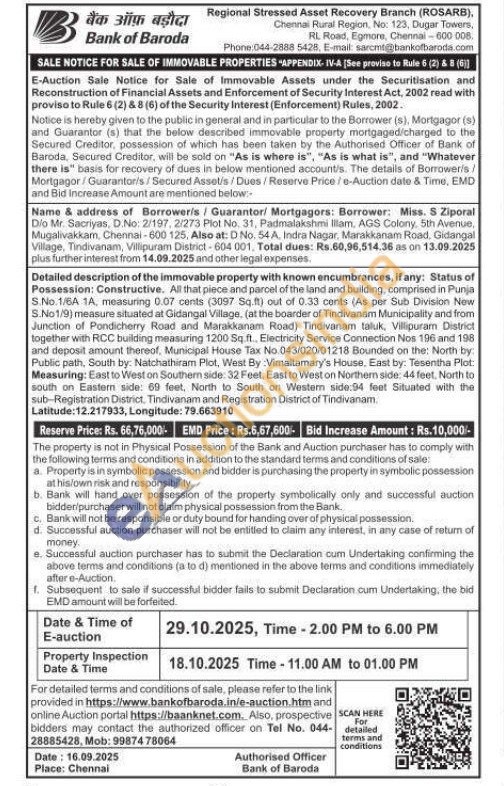 All that piece and parcel of the land and building, comprised in Punja S.No.1/6A 1A, measuring 0.07 cents (3097 Sq.ft) out of 0.33 cents (As per Sub Division New S.No1/9) measure situated at Gidangal Village, (at the boarder of Tindivanam Municipality and from Junction of Pondicherry Road and Marakkanam Road) Tindivanam taluk, Villipuram District together with RCC building measuring 1200 Sq.ft., Electricity Service Connection Nos 196 and 198 and deposit amount thereof, Municipal House Tax No 043/020/01218 Bounded on the: North by: Public path, South by: Natchathiram Plot, West By Vimaltamary's House, East by: Tesentha Plot: Measuring: East to West on Southern side: 32 Feet, East to West on Northern side: 44 feet, North to south on Eastern side: 69 feet, North to South on Western side:94 feet Situated with the sub-Registration District, Tindivanam and Registration District of Tindivanam. Latitude: 12.217933, Longitude: 79.663910