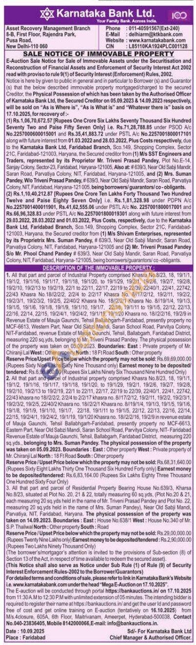 All that part and parcel of Industrial Property comprised Khasra No:8/23, 18, 19/1/1, 19/1/2, 19/1/16, 19/1/17, 18/1/18, 19/1/20, to 19/1/29, 19/2/1, 1826, 19/2/7, 19/2/6 19/2/10, 19/2/13 to 19/2/19, 22/1 to 22/11, 22:17, 22/19 to 22:39, 22/40/1,22/41,22742, 22:43 Khasra No. 18/2/22, 2/2/4 № 2/2/17 Khasra No. 8/17/2/12, 192/11, 19/2/2 10/2/3/1, 19/2/3/2, 19/2/5, 22/40/2 Khasra No. 18:2/2/1 Khasra No. 8/1/19/1/4, 19/10, 19/1/5, 19/1/6, 19/1/8, 19/1/9, 19/1/10, 19/1/7, 22/18, 10/1/11 to 19/1/5, 22:12, 22/13 22/16, 22/14, 22/15, 19/2/4/1, 19/2/4/2, 19/1/19, 19/1/20 Khasra no. 18/2/2/16, 192/9 in Revenue Estate of Mauja Gaunchi, Tehsil Ballabhgarh-Faridabad, presently property no MCF-6613, Westam Part. Near Old Sata Mandi, Saran School Road, Parvitya Colony, NIT-Fandabad, revenue Estate of Mauja Gaunchi, Tehel, Ballabgarh, Faridabad District, measuring 220 sq yds, belonging to Mr. Triveni Prasad Pandey. The physical possession of the property was taken on 05.09.2023. Boundaries: East: Private property of Mr. Chiranji Lal West: Other property North: 18 Ft Road South: Other property