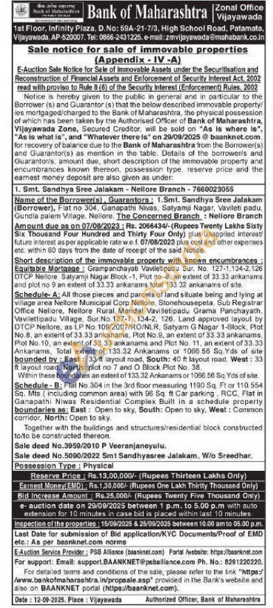 Grampanchayati Vaviletipadu Sur. No. 127-1,134-2,126 DTCP Nellore. Satyamji Nagar Block-1, Plot no -8, an extent of 33.33 ankanams and plot no 9 an extent of 33.33 ankanams total 133.32 ankanams of site Schedule- A: All those pieces and parcels of land situate being and lying al village area Nellore Municipal Corp Nellore, Stonehousepeta. Sub Registrar Office Nellore. Nellore Rural Mandal Vavilletipadu Grama Panchayath. Vavilettipadu Village, Sur.No. 127-1, 134-2, 126, Land approved layout by DTCP Nellore, as LP No. 109/2007/RO/NLR, Satyam G Nagar 1-Block, Plot No.8, an extent of 33.33 ankanams, Plot No.9, an extent of 33.33 ankanams, Plot No. 10, an extent of 33.33 ankanams and Plot No. 11, an extent of 33.33 Ankanams, Total extent of 133.32 Ankanams or 1066.56 Sq. Yds of site bounded by: East: 33 ft layout road, South: 40 ft layout road. West: 33 ft layout road, North: plot no 7 and O Block Plot No. 38. Within these boundaries an extent of 133.32 Ankanams or 1086.56 Sq. Yds of site Schedule-B: Flat No 304 in the 3rd floor measuring 1190 Sq. Ft or 110.554 Sq. Mts (including common area) with 96 Sq ft Car parking, RCC, Flat in Ganapathi Niwas Residential Complex Built in a schedule property boundaries as: East: Open to sky, South: Open to sky, West: Common corridor, North: Open to sky. Together with the buildings and structures/residential block constructed to/to be constructed thereon. Sale deed No.3959/2010 P Veeranjaneyulu. Sale deed No.5090/2022 Smt Sandhyasree Jalakam, W/o Sreedhar