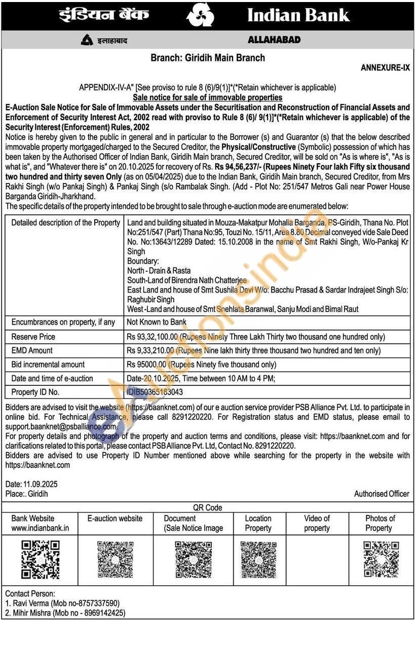 Land and building situated in Mouza-Makatpur Mohalla Barganda, PS-Giridih, Thana No. Plot No:251/547 (Part) Thana No:95, Touzi No. 15/11, Area 8.80 Decimal conveyed vide Sale Deed No. No:13643/12289 Dated: 15.10.2008 in the name of Smt Rakhi Singh, W/o-Pankaj Kr Singh