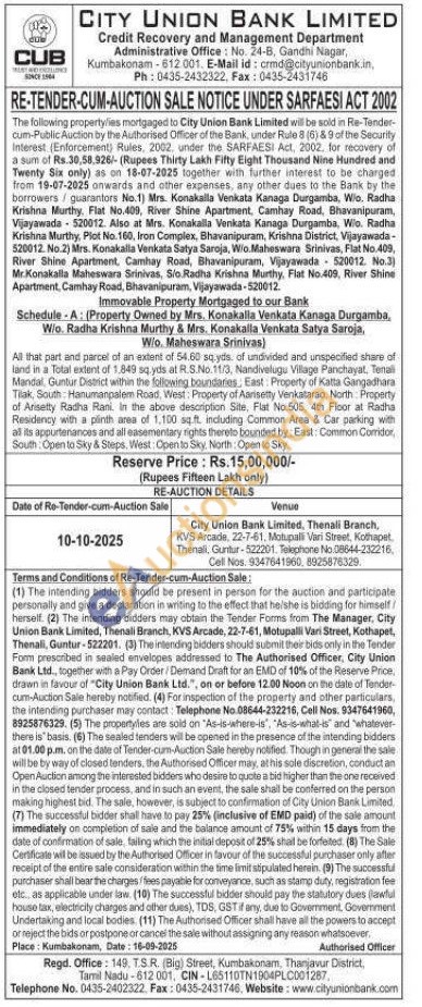 All that part and parcel of an extent of 54.60 sq yds. of undivided and unspecified share of land in a Total extent of 1,849 sq, yds at R.S.No. 11/3, Nandivelugu Village Panchayat. Tenali Mandal, Guntur District within the following boundaries, East: Property of Katta Gangadhara Tilak, South: Hanumanpalem Road, West: Property of Aansetty Venkataran, North Property of Arisetty Radha Rani. In the above description Site, Flat No.505, 4th Floor at Radha Residency with a plinth area of 1,100 sq.ft. including Common Area & Car parking with all its appurtenances and all easementary rights thereto bounded by East: Common Corridor, South: Open to Sky & Steps. West: Open to Sky, North: Open to Sky