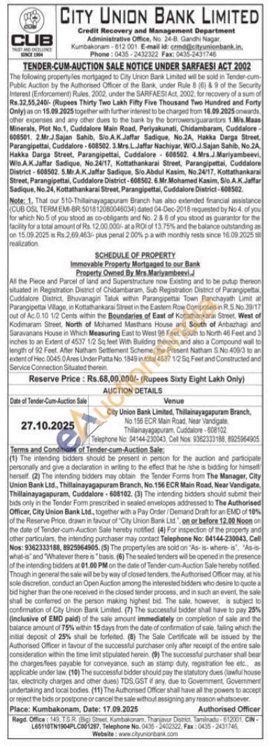 All the Piece and Parcel of land and Superstructure now Existing and to be putup thereon situated in Registration District of Chidambaram, Sub Registration District of Parangipetta, Cuddalore District, Bhuvanagini Taluk within Parangipettai Town Panchayath Limit at Parangipettai Village, in Kottathankarai Street in the Eastern Row Comprised in R.S.No.39/17 out of Ac. 0.10 1/2 Cents within the Boundaries of East of Kottathankarai Street, West of Kodimaram Street, North of Mohamed Masthans House and South of Anbazhagi and Saravanans House in Which Measuring East to West 98 Feet, South to North 46 Feet and 3 inches to an Extent of 4537 1/2 Sq. feet With Building thereon and also a Compound wall to length of 92 Feet. After Natham Settlement Scheme, the Present Natham S.No. 409/3 to an extent of Hec 0045.0 Ares Under Patta No. 1849 in total 4537 1/2 Sq. Feet and Constructed and Service Connection Situated therein.