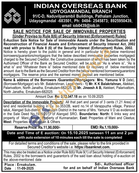 Description of the immovable Property: All that part and parcel of 3 cents (1.21 Ares) of land and residential building in Sy. no.353/2B, ward no.14 of Varappuzha village, Paravur taluk, Alangad Sub-district, Ernakulam District in the name of Mrs. Yamuna V D as evidenced in the Sale Deed No.1976/2011 of Alangad SRO. Boundaries: North: 6 links way and property of Mani; South: Property of Kunnanadan; East: Properties of Mani and Cleetus; West: Properties of Rajappan & Others