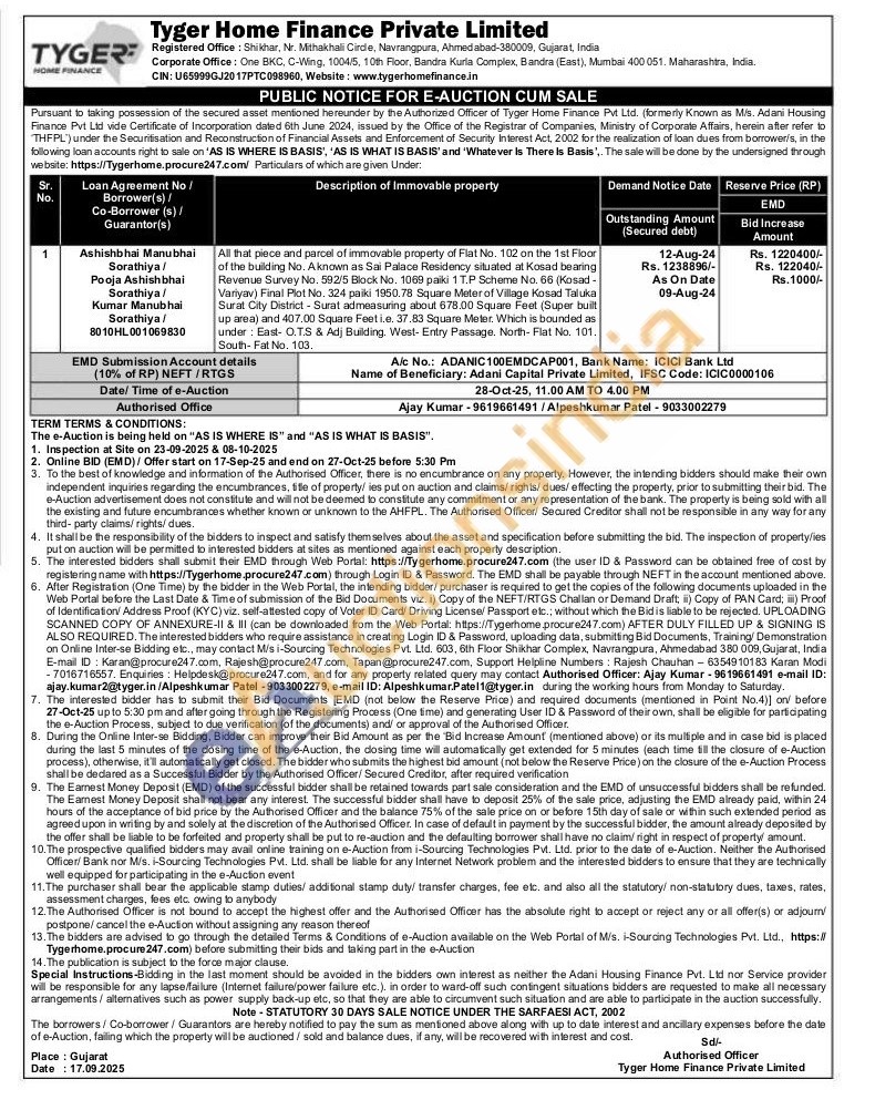 All that piece and parcel of immovable property of Flat No. 102 on the 1st Floor of the building No. Aknown as Sai Palace Residency situated at Kosad bearing Revenue Survey No. 592/5 Block No. 1069 paiki 1T.P Scheme No. 66 (Kosad-Variyav) Final Plot No. 324 paiki 1950.78 Square Meter of Village Kosad Taluka Surat City District-Surat admeasuring about 678.00 Square Feet (Super built up area) and 407.00 Square Feeti.e. 37.83 Square Meter. Which is bounded as under: East- O.T.S & Adj Building. West-Entry Passage. North- Flat No. 101. South-Fat No. 103
