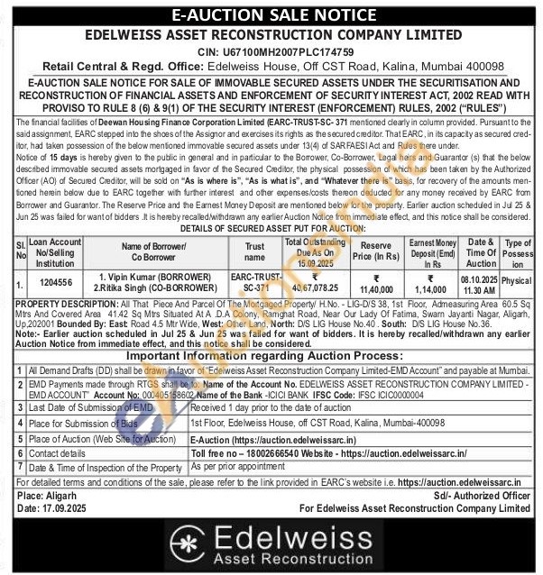 All That Piece And Parcel Of The Mortgaged Property H.No.LIG-D/S 38, 1st Floor, Admeasuring Area 60.5 Sq Mtrs And Covered Area 41.42 Sq Mtrs Situated At A D.A Colony, Ramghat Road, Near Our Lady Of Fatima, Swarn Jayanti Nagar, Aligarh, Up,202001 Bounded By: East Road 4.5 Mtr Wide, West: Other Land, North: DIS LIG House No.40, South: D/S LIG House No.36. immediate effect, and this notice shall be considered. Note: Earlier auction scheduled in Jul 25 & Jun 25 was failed for want of bidders. It is hereby recalled/withdrawn