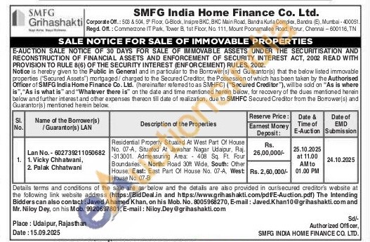Residential Property Situated At West Part Of House No. 07-A. Situated At Jawahar Nagar Udaipur, Ra -313001. Admeasuring Area 408 Sq. Ft. Four Boundaries: North: Road 30ft Wide, South: Other House, East: East Part Of House No. 07-A, West: House No. 07-B