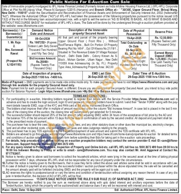 All that part and parcel of the property bearing Upper Ground Floor (Front Rhs), Without Rool/Terrace Rights, Built On Partion Of Property Bearing Plot No 149-F, Out Of Khasra No 21/19/1. Situated In The Revenue Estate Of Village Razapur Khurd, Delhi State Delhi, Colony Known As S-Block, Mohan Garden. Uttam Nagar, New Delhi 110059 Area Admeasuring (In Sq. Ft.): Property Type: Area Admeasuring Property Area: 342.00