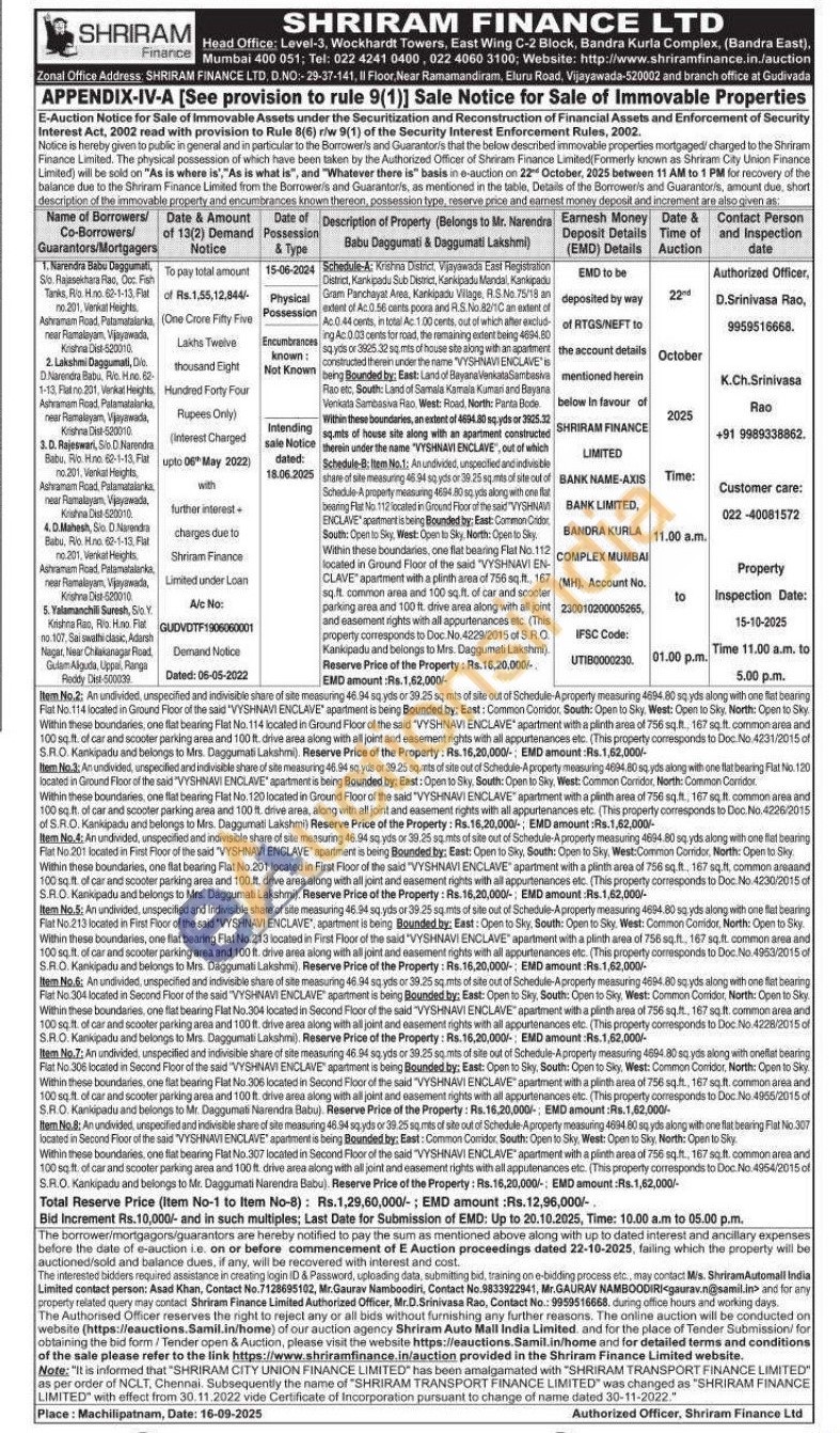 Item No.8: An undivided, unspecified and indivisible share of site measuring 46.94 sq.yds or 39.25 sq mits of site out of Schedule-Aproperty measuring 4694.80 sq yds along with one flat bearing Flat No.307 located in Second Floor of the said "VYSHNAVI ENCLAVE" apartment is being Bounded by: East: Common Comidor. South: Open to Sky, West: Open to Sky, North: Open to Sky Within these boundaries, one flat bearing Flat No.307 located in Second Floor of the said "VYSHNAVI ENCLAVE" apartment with a plinth area of 756 sq.ft. 167 sq.ft. common area and 100 sq.ft. of car and scooter parking area and 100 ft. drive area along with all joint and easement rights with all apputenances etc. (This property corresponds to Doc.No.4954/2015 of S.R.O. Kankipadu and belongs to Mr. Daggumati Narendra Babu).