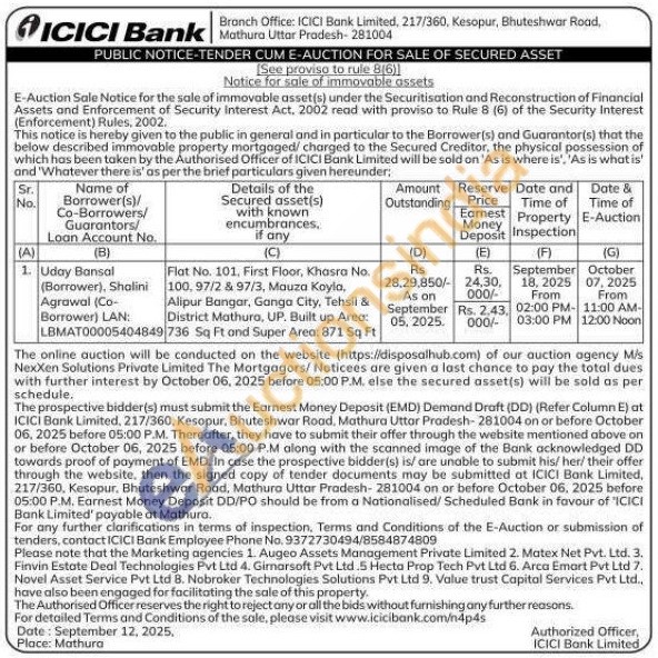 Flat No. 101, First Floor, Khasra No. 100, 97/2 & 97/3, Mauza Koyla, Alipur Bangar, Ganga City, Tehsil & District Mathura, UP. Built up Area: 736 Sq Ft and Super Area: 871 Sq Ft